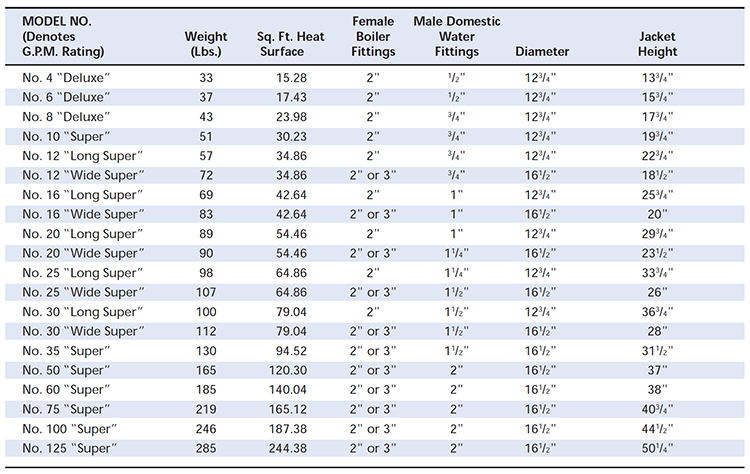 Capacities range from 4 gallons per minute to 125 gallons per minute. Models are available in both vertical and horizontal styles, with special models for radiation heaters, swimming pool heaters, indirect tank heaters, and converter applications. Consult factory regarding special models and applications.